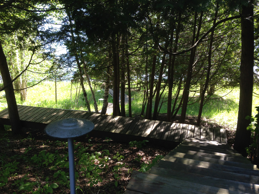 Wonder what happens here after dark? I’m intrigued by the contrast between the light and dark forms and the shadows. What kind of light would be cast at night by the one single mushroom lamp-post, or maybe there are more. What does this walkway lead to and is this safe?