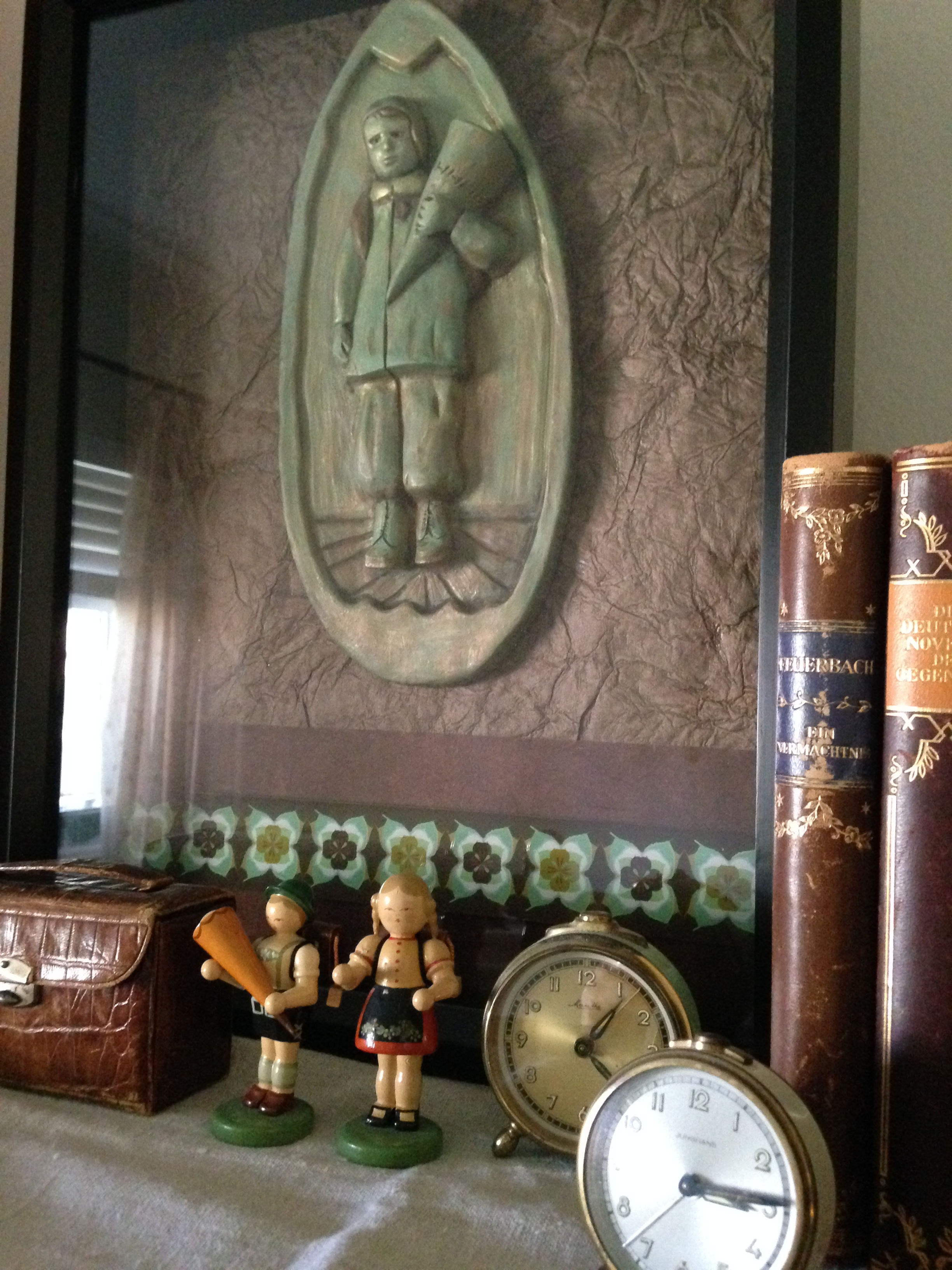 The expression on his face is priceless. That photo inspired me to create a collage, and a ceramic piece, as pictured above in a shadow box display. Spending creative time to stylize all the German items my Grandparents saved over the years is one of my favorite ways to decorate. As a graphic artist, combining old hand-written letters from Europe and postcard memorabilia helps me to connect the past to the present in a collage.