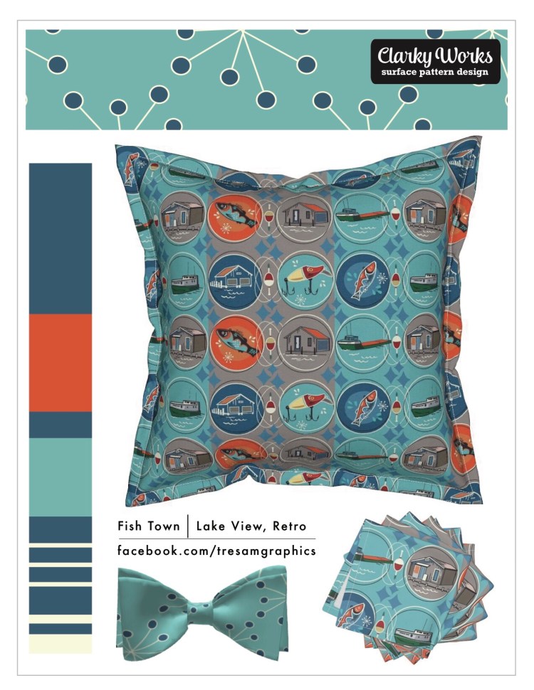My artwork depicts the village with a modern retro vibe with a mix of 1960’s atomic design style. The pattern design can be printed on a variety of products. The tiny bow tie in a satin fabric would be a a fun statement piece for a ring bearer at a Lakefront wedding!