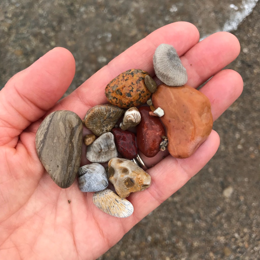 We love to rock hunt. I was surprised when the first one I saw was a Petoskey stone! I found two small ones within 15 feet. A little boy on the beach yelled out, “I found a Petoskey stone!” That made me smile.π
